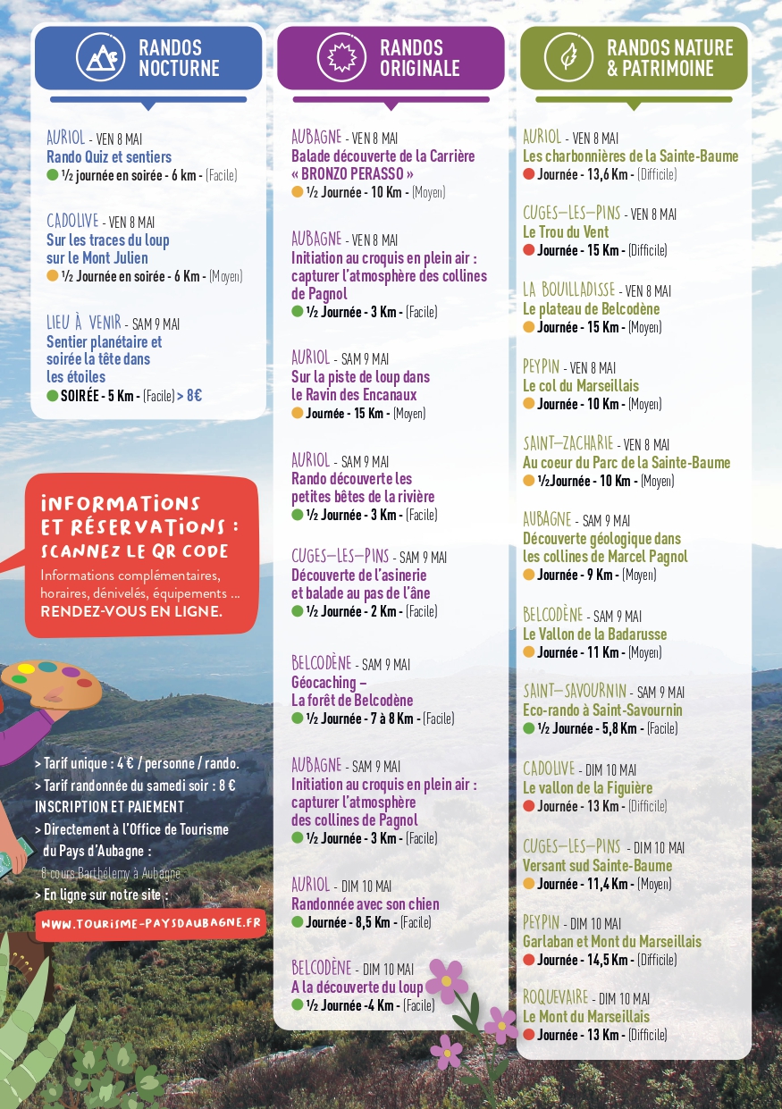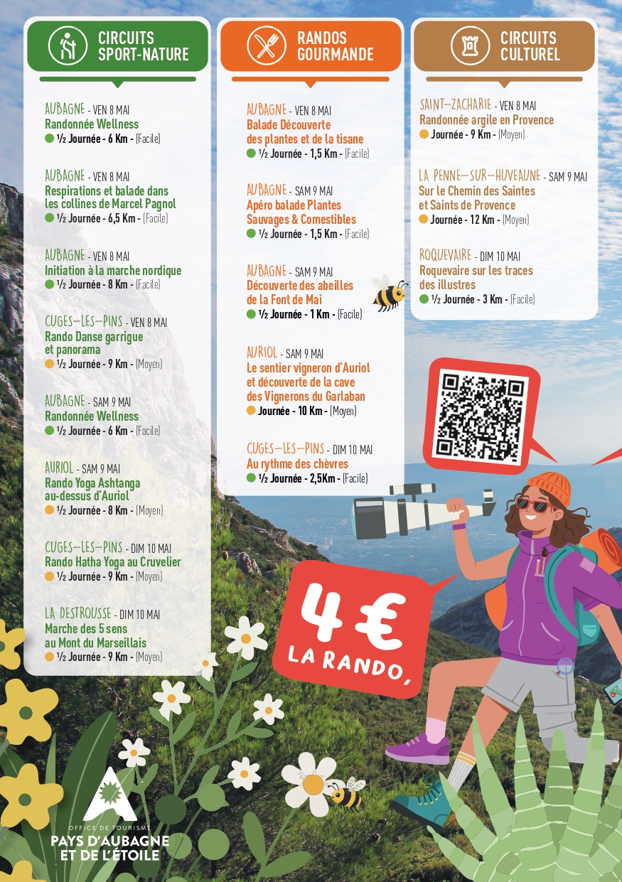 Chaque année, le Pays d’Aubagne et de l’Étoile invite habitants et visiteurs à enfiler leurs chaussures de marche pour participer au Festival de randonnées. À travers une programmation riche et variée, l’événement propose de découvrir les paysages emblématiques du territoire, du Garlaban à la Sainte-Baume, lors de balades thématiques accessibles à tous. Entre nature, patrimoine et convivialité, ce rendez-vous met à l’honneur toute la diversité des sentiers provençaux.