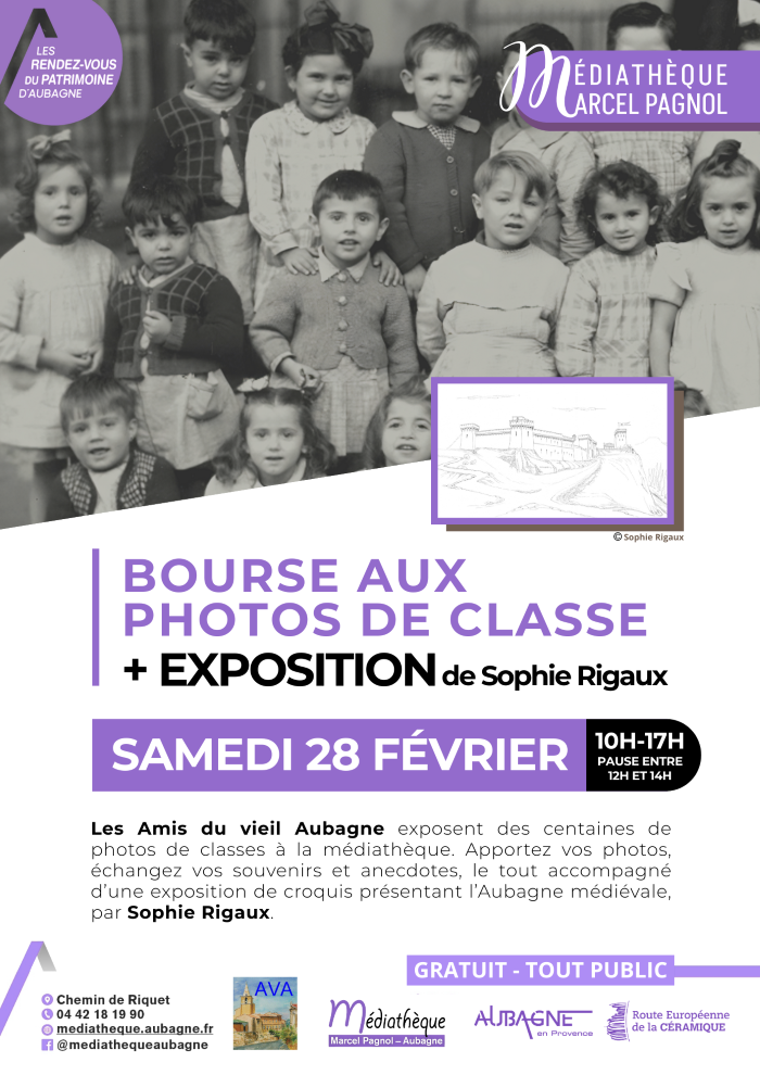 Expositions de photos de classe des Amis du Vieil Aubagne et d’esquisses sur l’Aubagne médiévale de Sophie Rigaux.