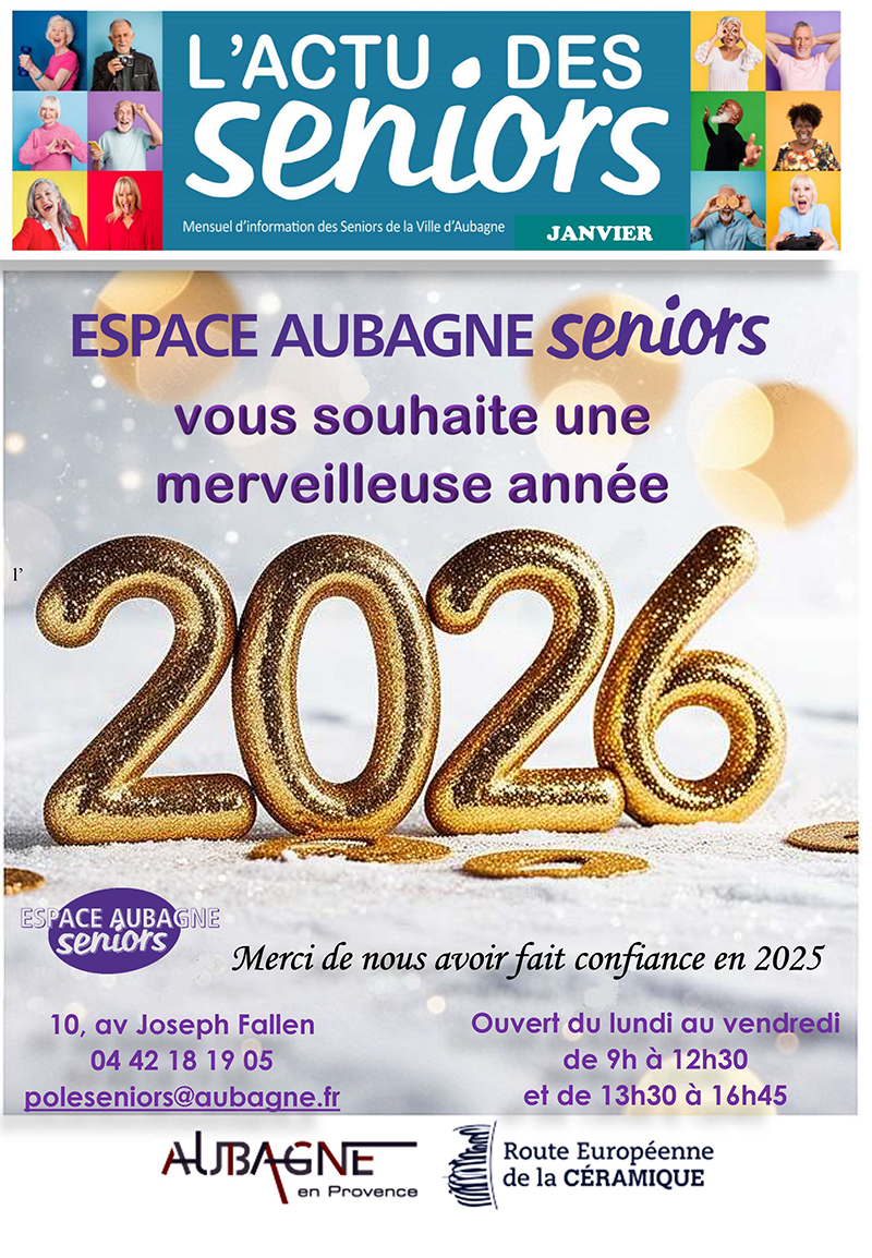 Retrouvez toute l'Actu des seniors du mois de janvier. Bonne lecture, à très vite à l'Espace Aubagne Seniors, 10 Avenue Joseph Fallen – 04 42 18 19 05