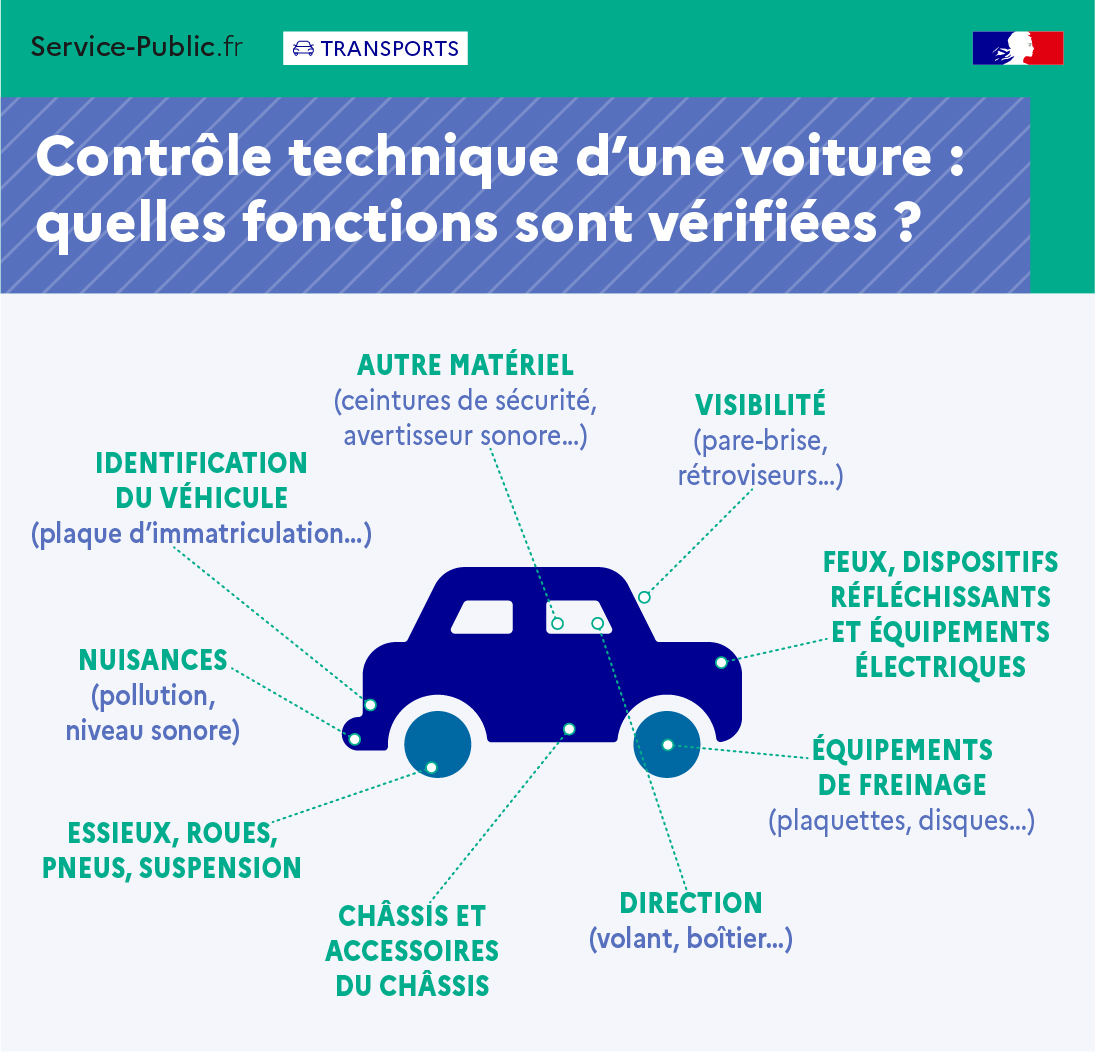 Les fonctions vérifiées lors du contrôle technique d’une voiture sont les suivantes :