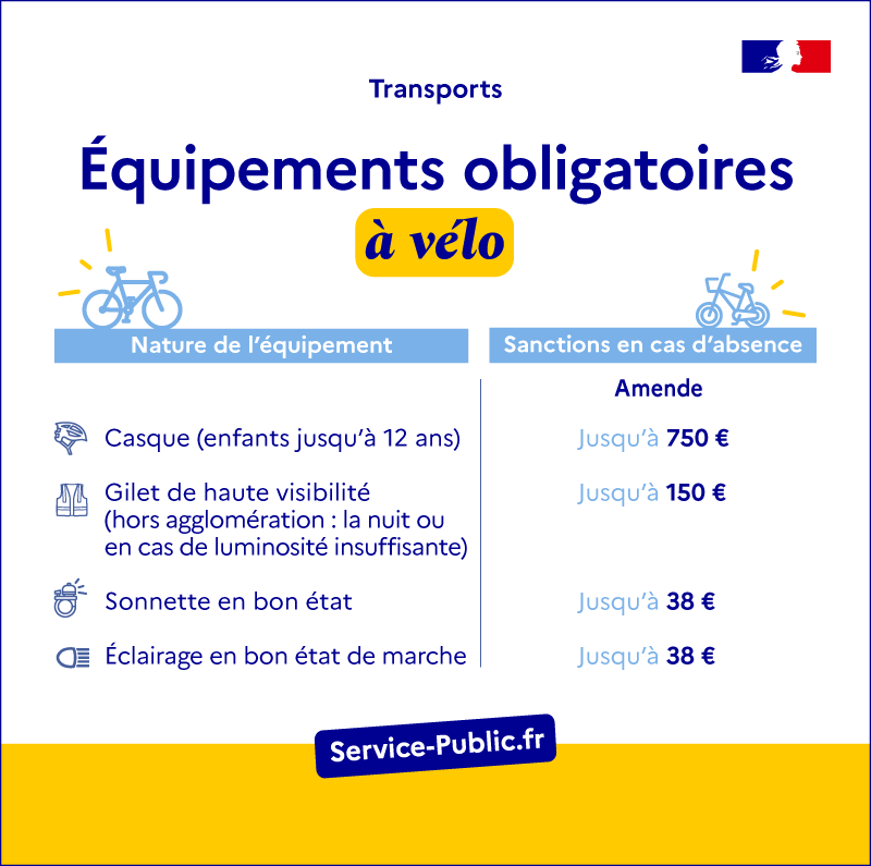 Casque. Un enfant de moins de 12 ans doit porter un casque à vélo. Ne pas respecter cette obligation est puni par une amende pouvant aller jusqu’à 750 €.