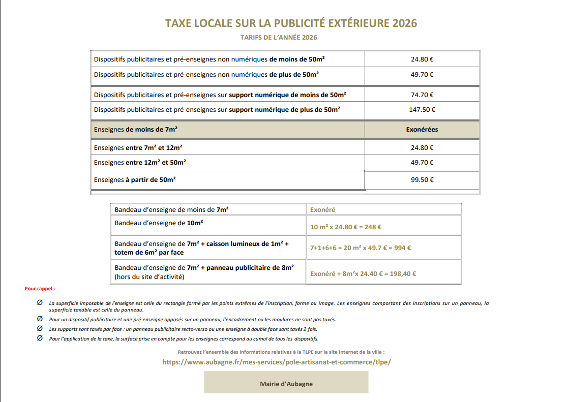 La Taxe locale sur la publicité extérieure (TLPE) est une taxe facultative instaurée par la commune pour les supports publicitaires fixes situés à l’extérieur, tels que les enseignes commerciales, les pré‑enseignes et les panneaux publicitaires. Elle concerne les entreprises ou personnes qui exploitent ces dispositifs visibles depuis une voie ouverte à la circulation publique.